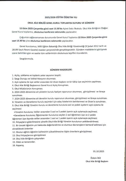 2025-2026 Eğitim-Öğretim Yılı Okul Aile Birliği Genel Kurulu